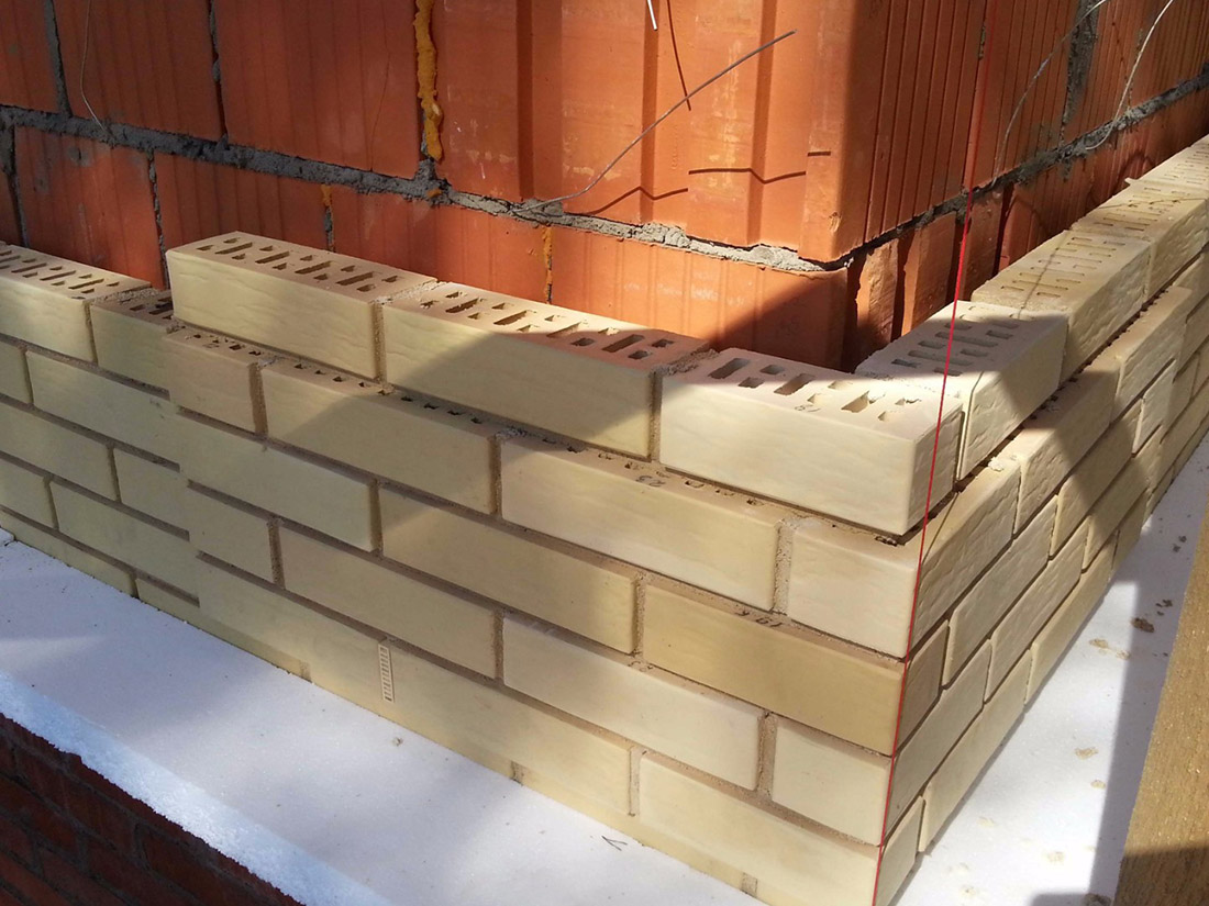 Profis erkennt man daran, wie sie die Ziegel legen. Ein unqualifizierter Maurer trägt den Mörtel direkt auf den Ziegel auf, was nicht korrekt ist. Ein spezielles Armierungsgewebe sollte verwendet werden, das auf den Stein gelegt wird, und der Mörtel wird darauf aufgetragen. Dies verhindert, dass der Mörtel die Hohlräume im Ziegel füllt und die Wärmedämmeigenschaften verloren gehen. Unser Team verwendet immer Gewebe, damit Ihr Haus warm bleibt. Ein guter Arbeiter berücksichtigt immer diese Details.